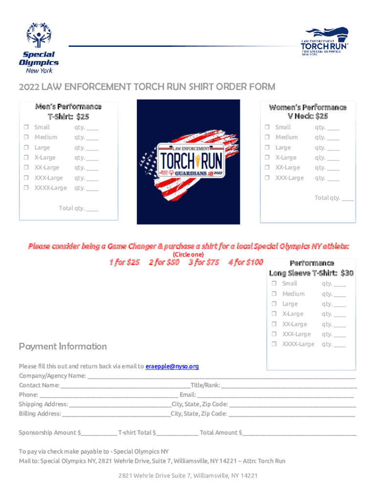 2022 LAW ENFORCEMENT TORCH RUN SHIRT ORDER FORM Men Performance Shirt: $25Womens Performance V Neck: $25 Small qty. ___ Small qty. ___ Medium qty. ___ Medium qty. ___ Large qty. ___ Large qty. ___