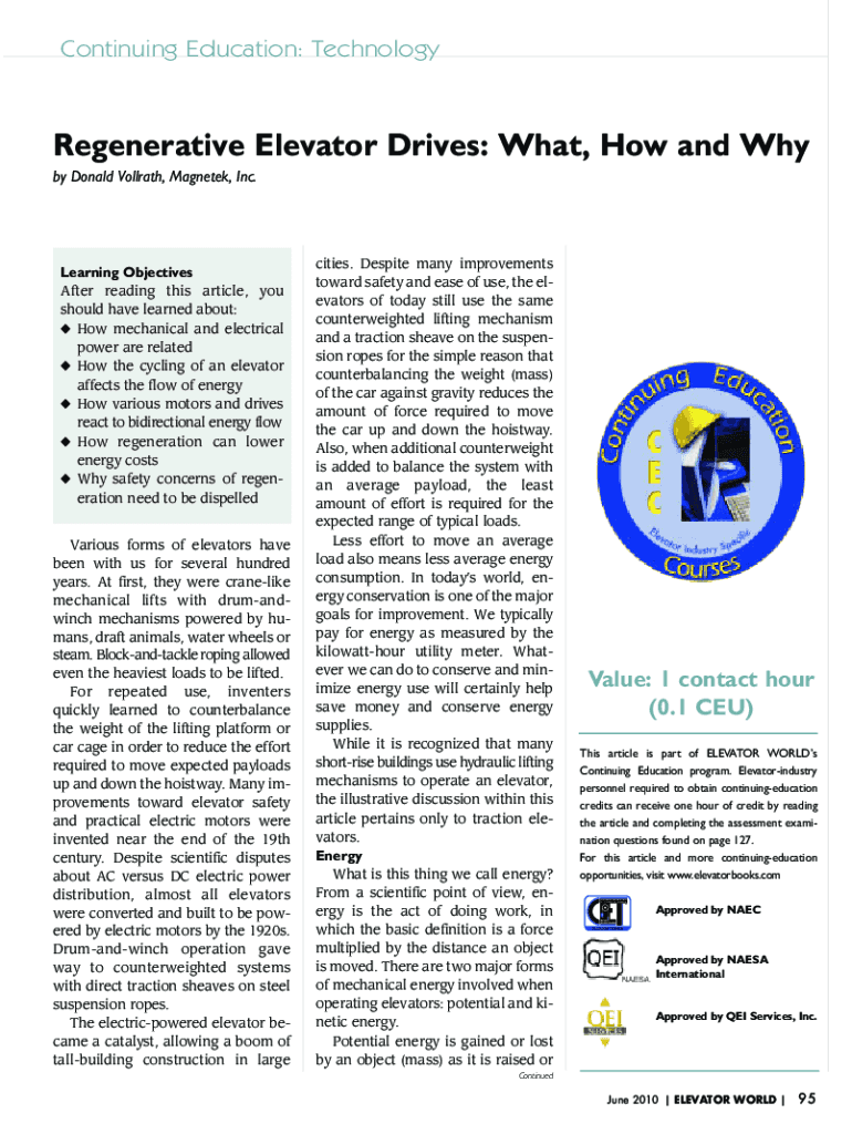 Continuing Education: TechnologyRegenerative Elevator Drives: What, How and Why by Donald Tolerate, Magnetic, Inc. Learning Objectives After reading this article, you should have learned about: How