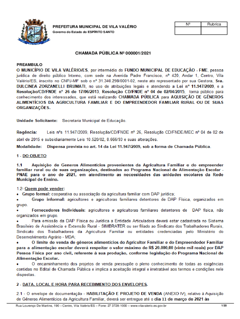PREFECTURE MUNICIPAL DE VILA VALRIONRubricaGoverno do Est ado do ESPRIT SANTOCHAMADA PBL ICA N 000001/2021 PREAMBLE O MUNICIPAL DE VILA VAL RIO/ES, POR intermix do FUNDS MUNICIPAL DE EDUC AO ME, person