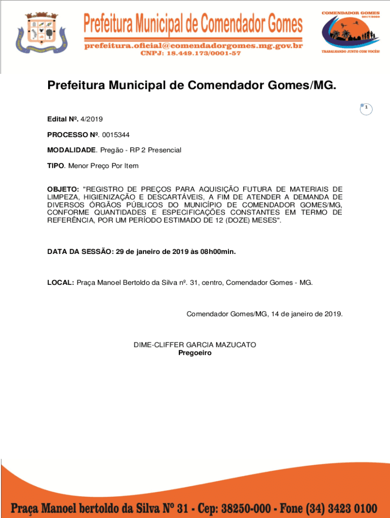 Prefecture Municipal de Comendador Gomes/MG. 1Edital N. 4/2019 PROCESS N. 0015344 MODALIDADE. PRESO RP 2 Presence TIP. Minor Pro POR ItemOBJETO: \” REGISTRY DE PRESS PARA AQUINO FUTURE DE MATERIALS