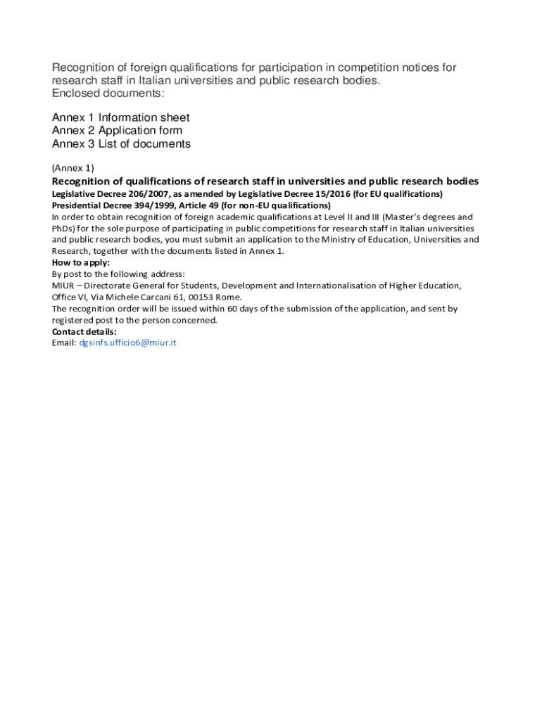 Recognition of foreign qualifications for participation in competition notices for research staff in Italian universities and public research bodies. Enclosed documents: Annex 1 Information sheet