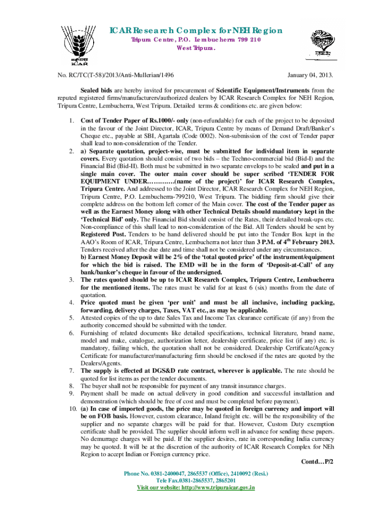 CAR Research Complex for NEH Region Tripura Center, P.O. Lembucherra 799 210 West Tripura. No. RC/TC(T58)/2013/AntiMullerian/1496January 04, 2013. Sealed bids are hereby invited for procurement of