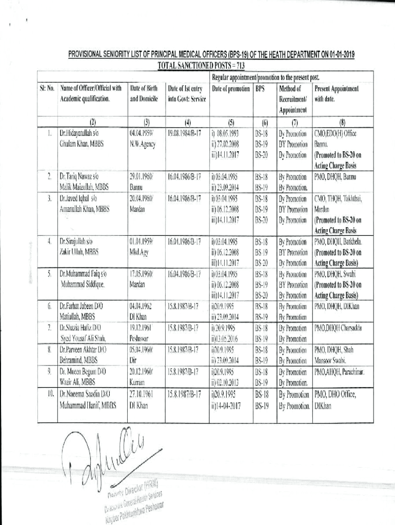 PROVISIONAL SENIORITY LIST OF PRINCIPAL MEDICAL OFFICERS (BPS19) OF THE HEATH DEPARTMENT ON 01012019TOTAL SANCTIONED POSTS 713