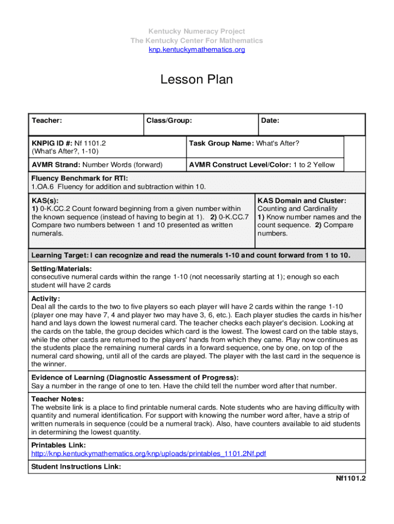 Kentucky Numeracy Project The Kentucky Center For Mathematics BNP.kentuckymathematics.lesson Headteacher: ___Class/Group: Date: ___ ___PIG ID #: NF 1101.2 (What\'s After?, 110)Task Group Name: What\'s