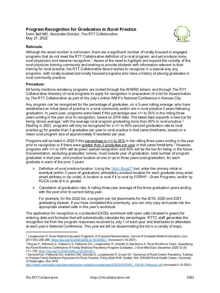 Program Recognition for Graduation to Rural Practice Darin Bell MD, Associate Director, The RTT Collaborative May 27, 2022Rationale: Although the exact number is not known, there are a significant