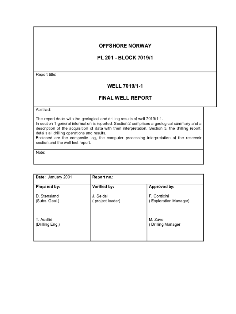 OFFSHORE NORWAY PL 201 BLOCK 7019/1 Report title:WELL 7019/11 FINAL WELL REPORT Abstract: This report deals with the geological and drilling results of well 7019/11. In section 1 general information