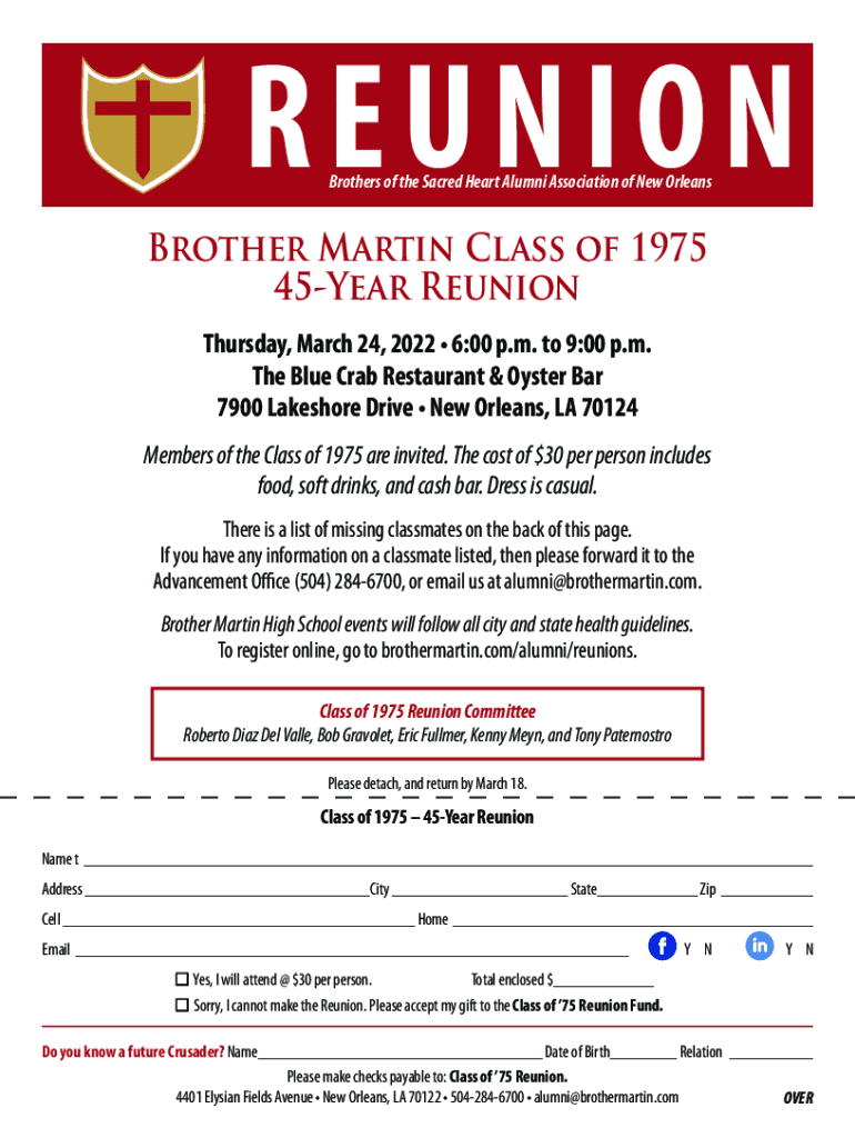 REUNION Brothers of the Sacred Heart Alumni Association of New OrleansBrother Martin Class of 1975 45Year Reunion Thursday, March 24, 2022 6:00 p.m. to 9:00 p.m. The Blue Crab Restaurant & Oyster