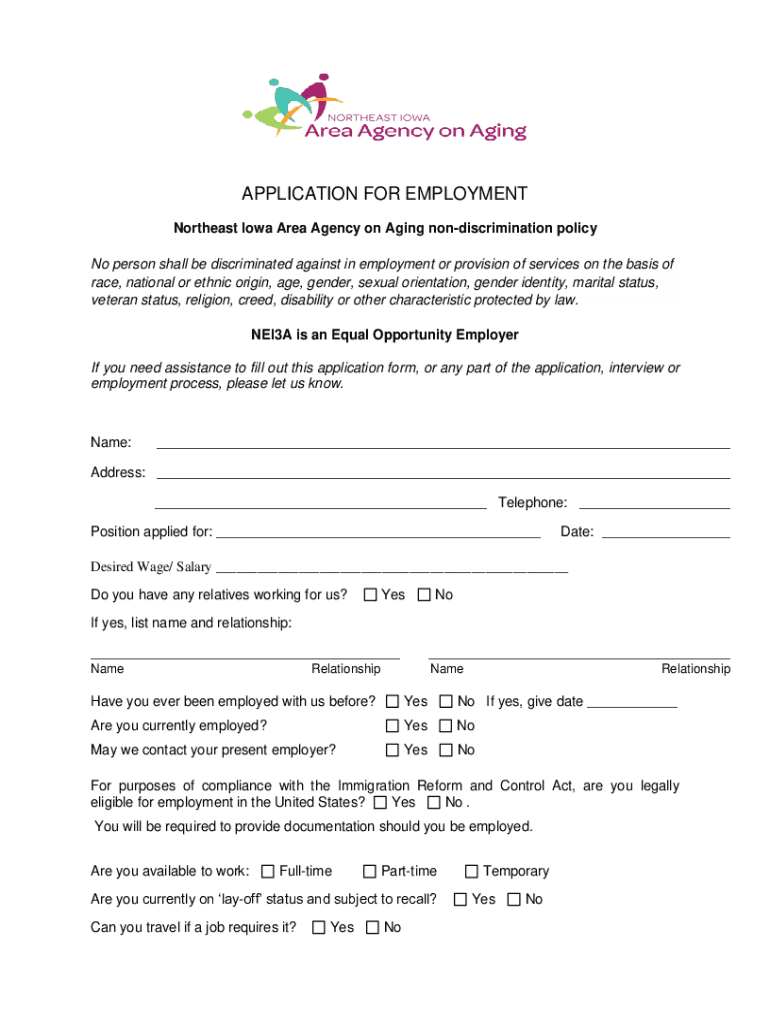 APPLICATION FOR EMPLOYMENT Northeast Iowa Area Agency on Aging nondiscrimination policy No person shall be discriminated against in employment or provision of services on the basis of race, national