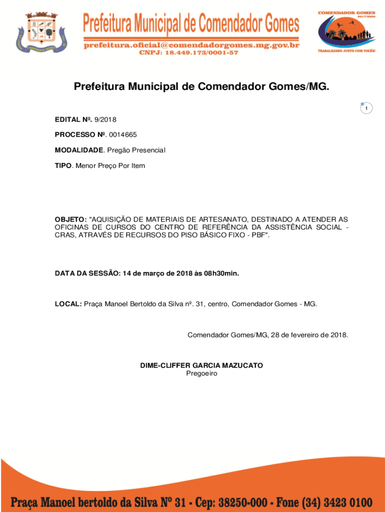 Prefecture Municipal de Comendador Gomes/MG. 1EDITAL N. 9/2018 PROCESS N. 0014665 MODALIDADE. PRESO Presence TIP. Minor Pro POR ItemOBJETO: \” AQUINO DE MATERIALS DE ARTISANAL, DESTINED A TENDER