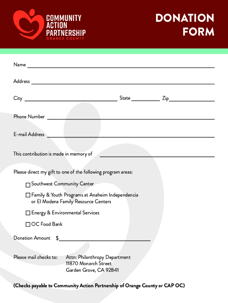 DONATION FORM Name Address StateCityZipPhone Number Email Address This contribution is made in memory of Please direct my gift to one of the following program areas: Southwest Community Center Family