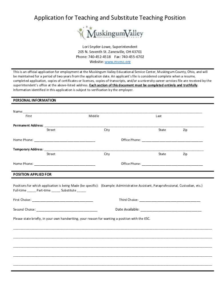 Application for Teaching and Substitute Teaching Position Lori Snyder Lowe, Superintendent 205 N. Seventh St. Janesville, OH 43701 Phone: 7404524518 Fax: 7404556702 Website: www.mvesc.org This is