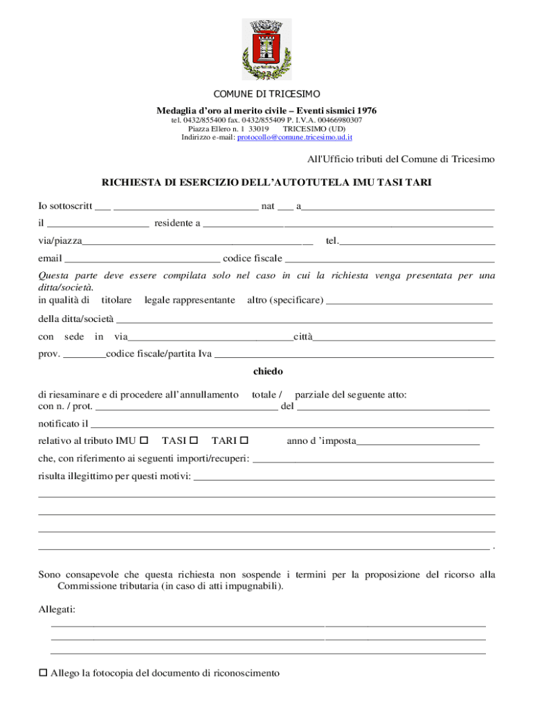 COMMUNE DI TRICESIMO Media door all merit civil Event seismic 1976 tel. 0432/855400 fax. 0432/855409 P. I.V.A. 00466980307 Piazza Elder n. 1 33019 TRICESIMO (UP) Indirizzo email: protocollo@comune.tricesimo.ud.itAll\'Office
