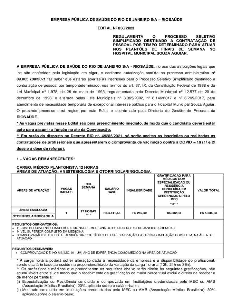 EMPRESS PBL ICA DE SADE DO RIO DE JANEIRO S/A ROSADO EDIT AL N 038/2023 REGALEMENT O PROCESS SELECTIVE SIMPLIFIED DESTINED A CONTRA TAO DE PERSONAL POR TEMPO DETERMINED PARA ATTAR NOS PLANTS DE FINALS