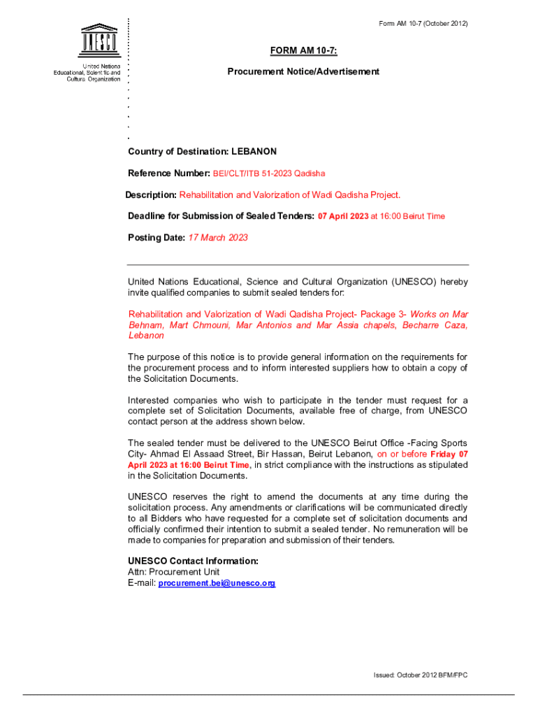 Form AM 107 (October 2012)FORM AM 107: Procurement Notice/AdvertisementCountry of Destination: LEBANON Reference Number: BEI/CLT/ITB 512023 Radish Description: Rehabilitation and Valorization of Wadi