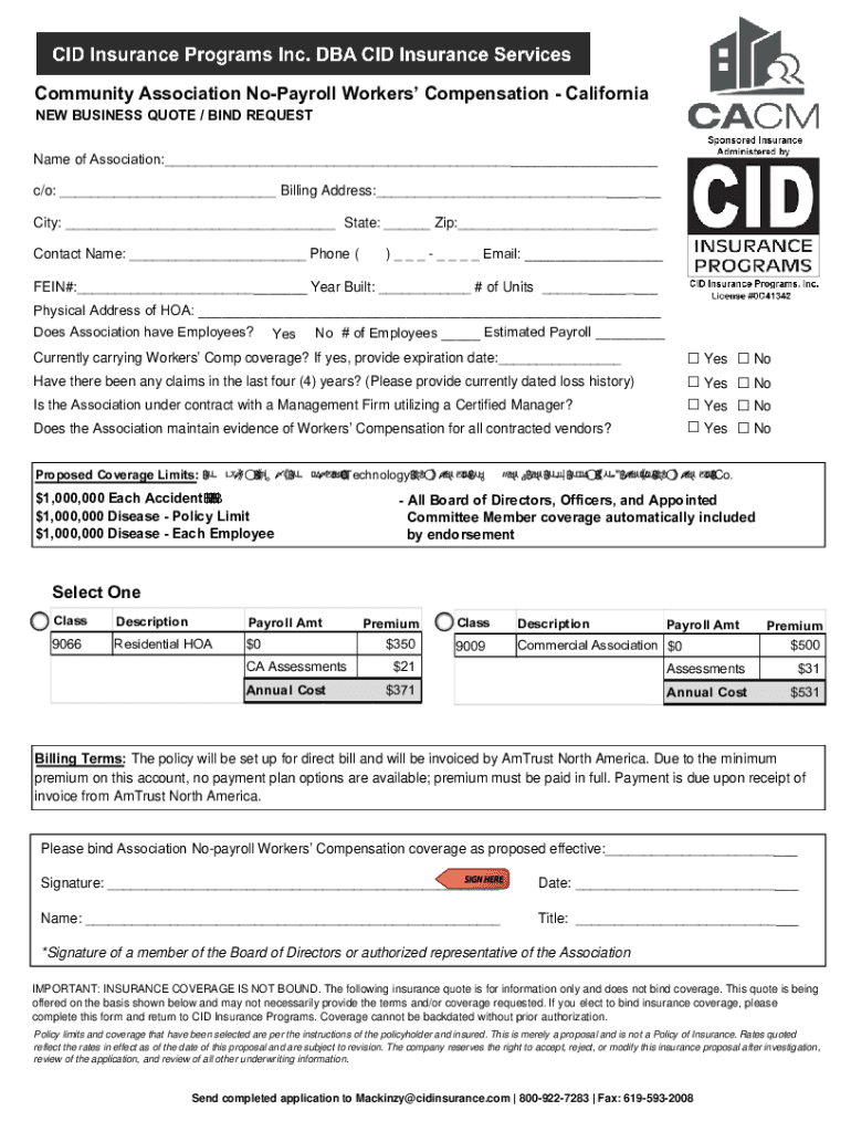 Community Association Payroll Workers Compensation California NEW BUSINESS QUOTE / BIND Sequestrate of Association:___ c/o: ___ Billing Address:___ City: ___ State: ___ Zip:___ Contact Name: ___ Phone