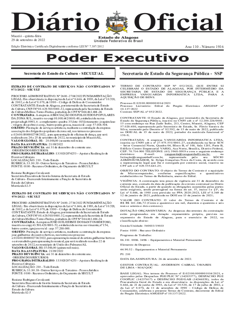Maya quintafeira 29 de September de 2022Ano 110 Nero 1916Edio Electronica Certificate Digitalmente conform LEI N 7.397/2012Poder Executive. Secretariat de Estado the Cultural SEC ULT/AL EVENTS FUNCTIONS.