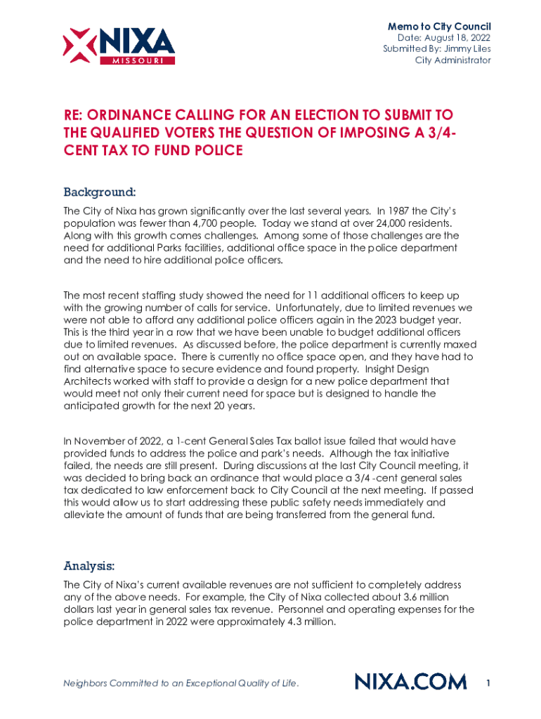 Memo to City Conciliate: August 18, 2022, Submitted By: Jimmy Lies City Administrator RE: ORDINANCE CALLING FOR AN ELECTION TO SUBMIT TO THE QUALIFIED VOTERS THE QUESTION OF IMPOSING A 3/4CENT TAX