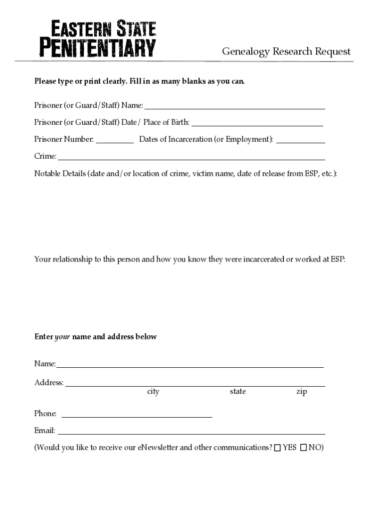 Genealogy Research Request Please type or print clearly. Fill in as many blanks as you can. Prisoner (or Guard/Staff) Name: ___ Prisoner (or Guard/Staff) Date/ Place of Birth: ___ Prisoner Number: