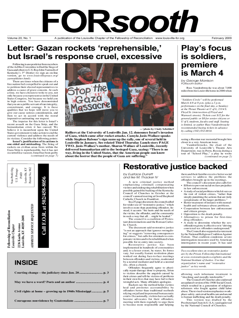 FORsoothVolume 20, No. 1A publication of the Louisville Chapter of the Fellowship of Reconciliation www.louisvillefor.orgLetter: Gaza rockets reprehensible, but Israels response cruel, excessively