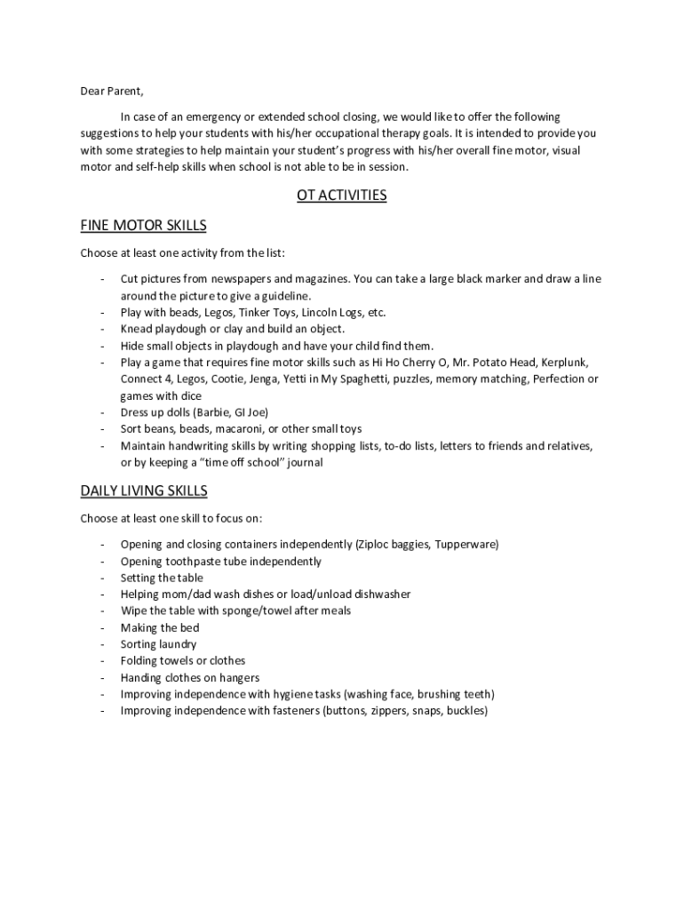 Dear Parent, In case of an emergency or extended school closing, we would like to offer the following suggestions to help your students with his/her occupational therapy goals. It is intended to provide