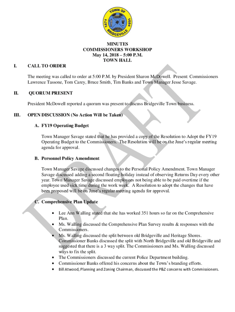 MINUTES COMMISSIONERS WORKSHOP May 14, 2018 5:00 P.M. TOWN HALL I.CALL TO ORDER The meeting was called to order at 5:00 P.M. by President Sharon McDowell. Present: Commissioners Lawrence Tass one,