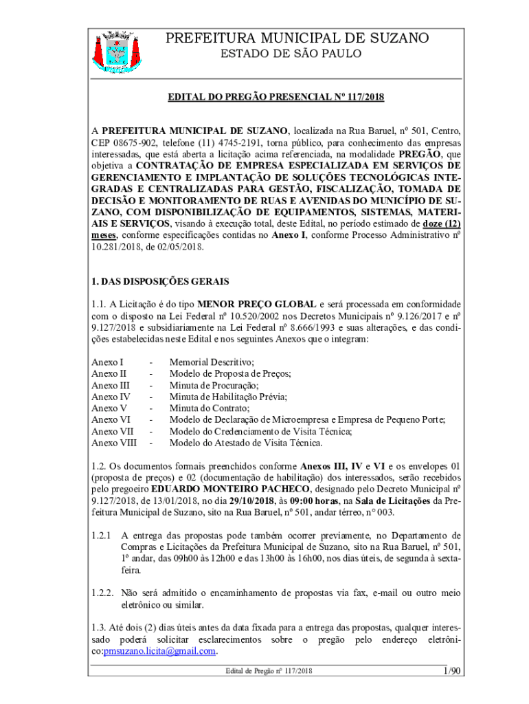 ESTATE DE SO PAULOEDITAL DO PRESO PRESENCE N 117/2018A PREFECTURE MUNICIPAL DE SUZANA, localized Na RUA Barrel, n 501, CENTR,