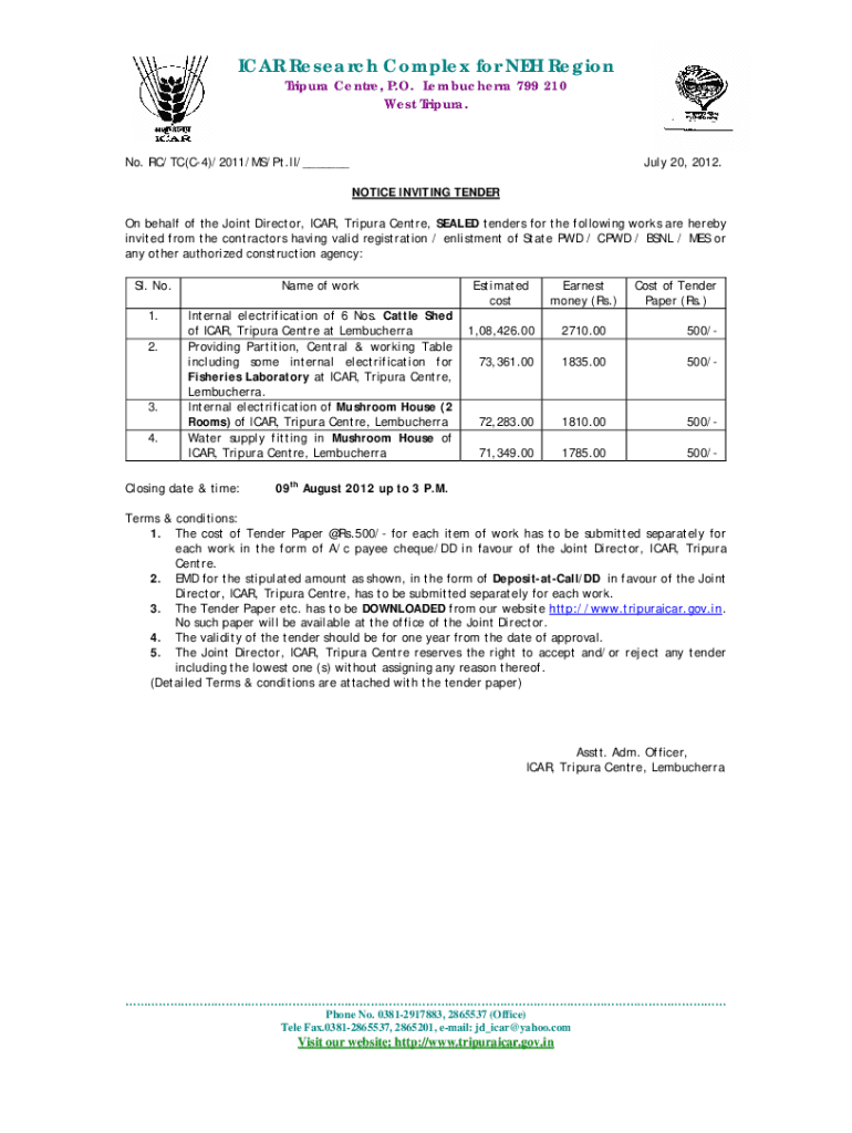 CAR Research Complex for NEH Region Tripura Center, P.O. Lembucherra 799 210 West Tripura. No. RC/TC(C4)/2011/MS/Pt.II/___July 20, 2012. NOTICE INVITING Tender behalf of the Joint Director, CAR, Tripura