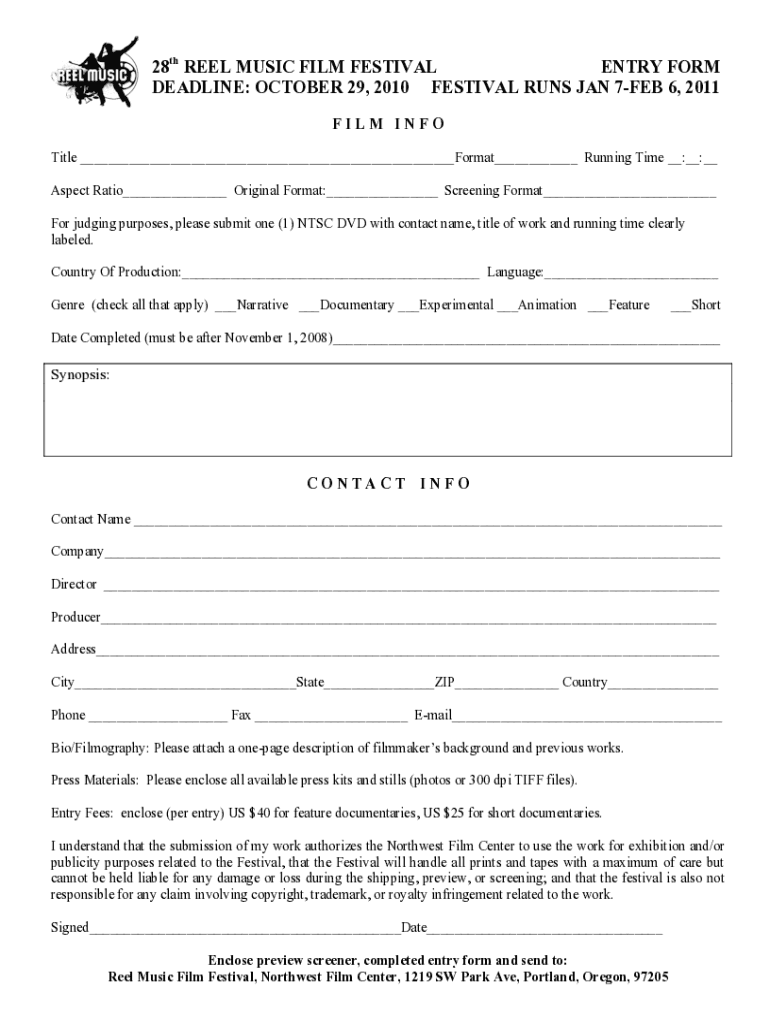 28th REEL MUSIC FILM FESTIVAL ENTRY FORM DEADLINE: OCTOBER 29, 2010, FESTIVAL RUNS JAN 7FEB 6, 2011 FILM INFO Title ___Format___ Running Time __:__:__ Aspect Ratio___ Original Format:___ Screening
