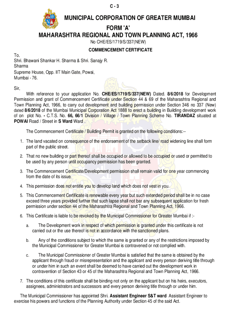 C3MUNICIPAL CORPORATION OF GREATER MUMBAI FORM \'A\' MAHARASHTRA REGIONAL AND TOWN PLANNING ACT, 1966 No CHE/ES/1719/S/337(NEW) COMMENCEMENT CERTIFICATE To, Sari. Hawaii Shankar H. Sharma & Sari.