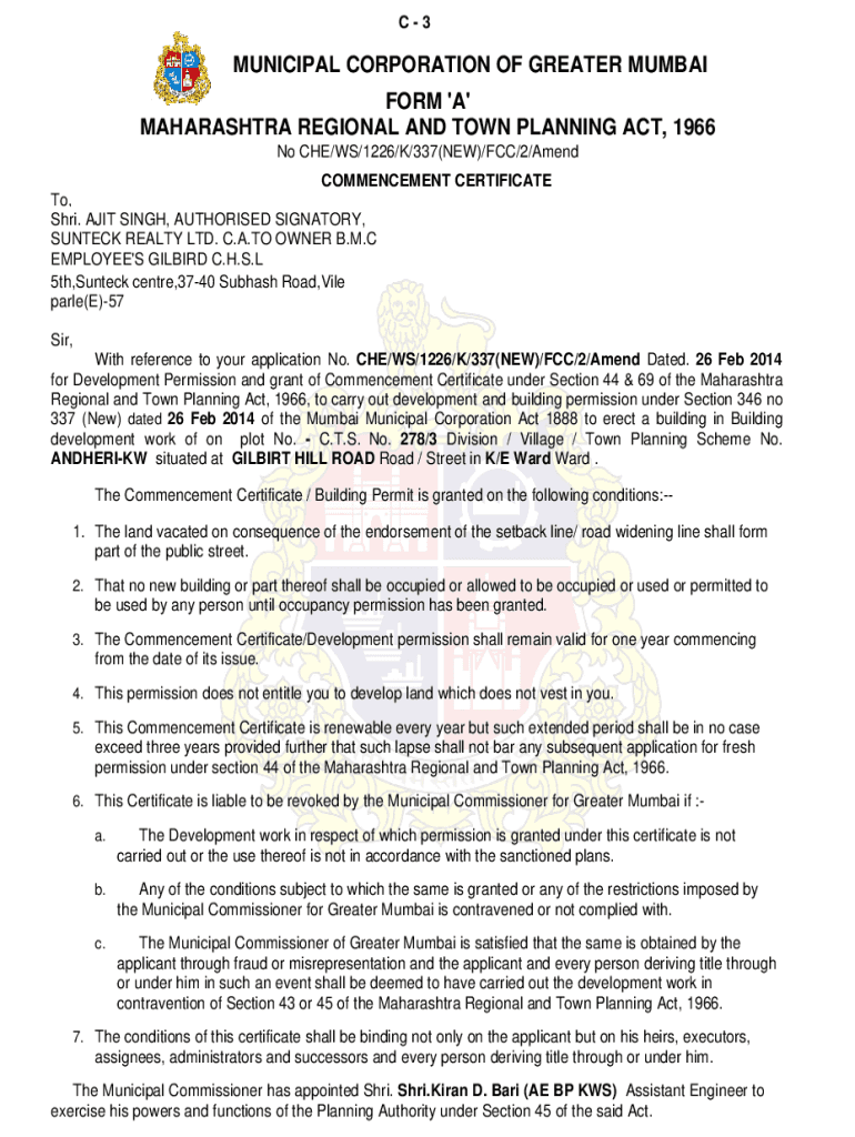 C3MUNICIPAL CORPORATION OF GREATER MUMBAI FORM \'A\' MAHARASHTRA REGIONAL AND TOWN PLANNING ACT, 1966 No CHE/WS/1226/K/337(NEW)/FCC/2/Amend COMMENCEMENT CERTIFICATE To, Sari. AIT SINGH, Authorized
