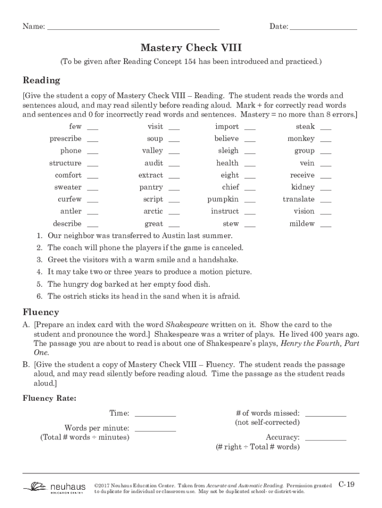 Name: ___Date: ___Mastery Check VIII (To be given after Reading Concept 154 has been introduced and practiced.) Reading [Give the student a copy of Mastery Check VIII Reading. The student reads the