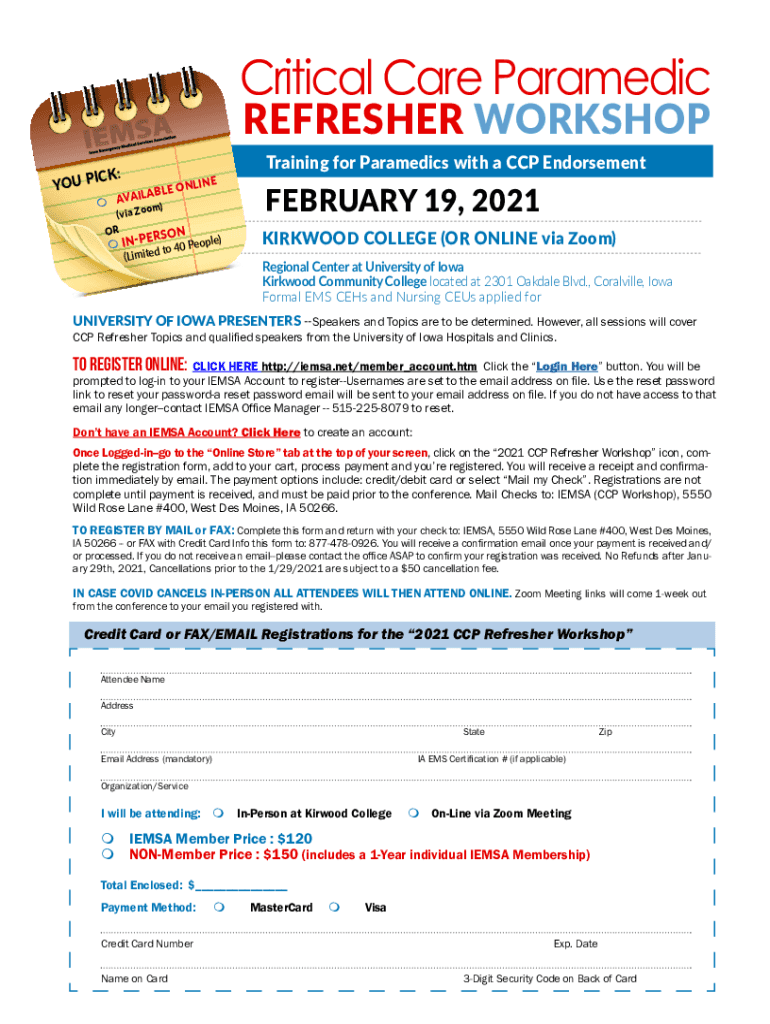 Critical Care Paramedic REFRESHER WORKSHOP: You are ABLE OAI LA m AV on)LINE(via ZO PERSON m INP d to 40 People) (LimiteTraining for Paramedics with a CCP EndorsementFEBRUARY 19, 2021 KIRKWOOD COLLEGE