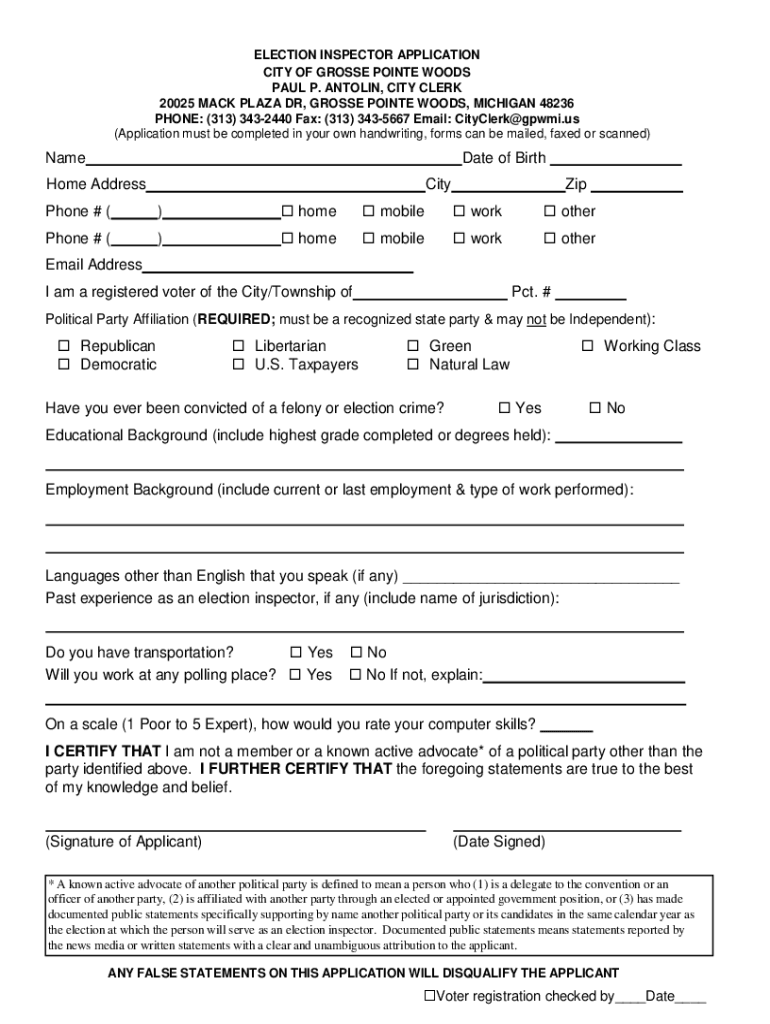 ELECTION INSPECTOR APPLICATION CITY OF GROSS POINT WOODS PAUL P. ANTONIN, CITY CLERK 20025 MACK PLAZA DR, GROSS POINT WOODS, MICHIGAN 48236 PHONE: (313) 3432440 Fax: (313) 3435667 Email: CityClerk@gpwmi.us