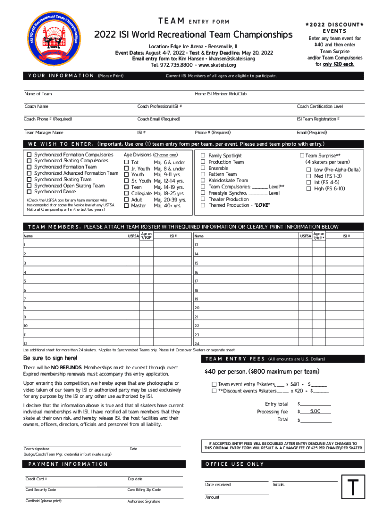 GEOMETRY FORM×2022DISCOUNT* EVENTS Enter any team event for $40 and then enter Team Surprise and/or Team Compulsories for only $20 each.2022 ISI World Recreational Team Championships Location: Edge