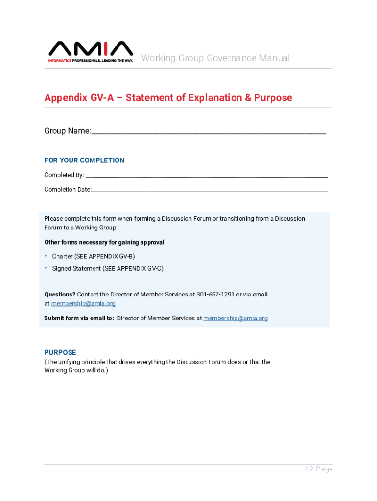 Working Group Governance ManualAppendix GVA Statement of Explanation & Purpose Group Name:___ FOR YOUR COMPLETION Completed By: ___ Completion Date:___Please complete this form when forming a Discussion