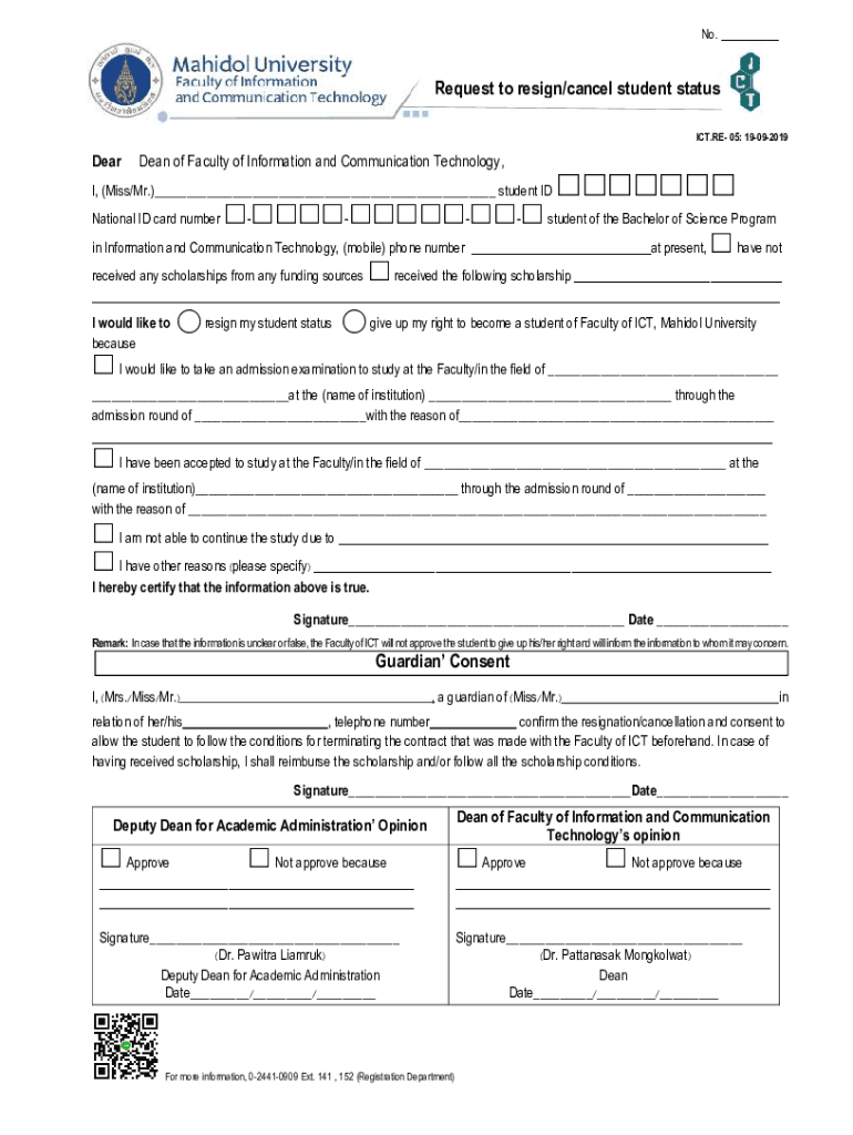 No. ___Request to resign/cancel student status ICT’RE 05: 19092019DearDean of Faculty of Information and Communication Technology, I, (Miss/Mr.)___ student ID student of the Bachelor of Science
