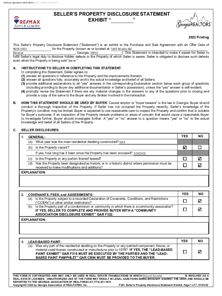 Dot loop signature verification: dtlp.us/8KdteqPetMfZSELLERS PROPERTY DISCLOSURE STATEMENT EXHIBIT ___ 2022 Printing This Sellers Property Disclosure Statement (Statement) is an exhibit to the Purchase