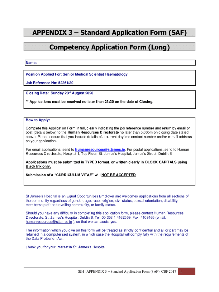 APPENDIX 3 Standard Application Form (SAF) Competency Application Form (Long) Name: Position Applied For: Senior Medical Scientist Hematology Job Reference No: 52261/20 Closing Date: Sunday 23rd August