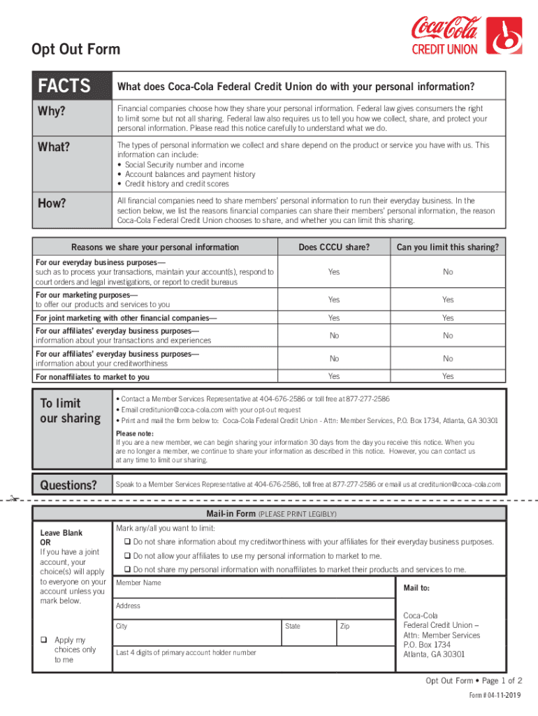 Opt-Out Form FormFACTSWhat What does Coca-Cola Federal Credit Union do with your personal information? Information? Why? Why? Financial companies choose to choose how they share your personal information.