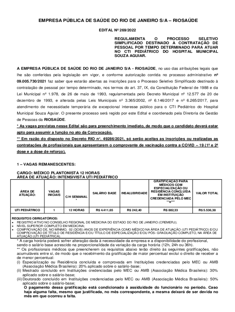 EMPRESS PBL ICA DE SADE DO RIO DE JANEIRO S/A ROSADO EDIT AL N 269/2022 REGALEMENT O PROCESS SELECTIVE SIMPLIFIED DESTINED A CONTRA TAO DE PERSONAL POR TEMPO DETERMINED PARA ATTAR NO CTI PEDIATRIC
