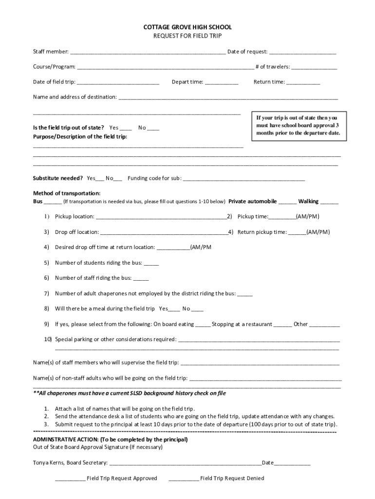 COTTAGE GROVE HIGH SCHOOL REQUEST FOR FIELD TRIP Staff member: ___ Date of request: ___ Course/Program: ___ # of travelers: ___ Date of field trip: ___Depart time: ___Return time: ___Name and address