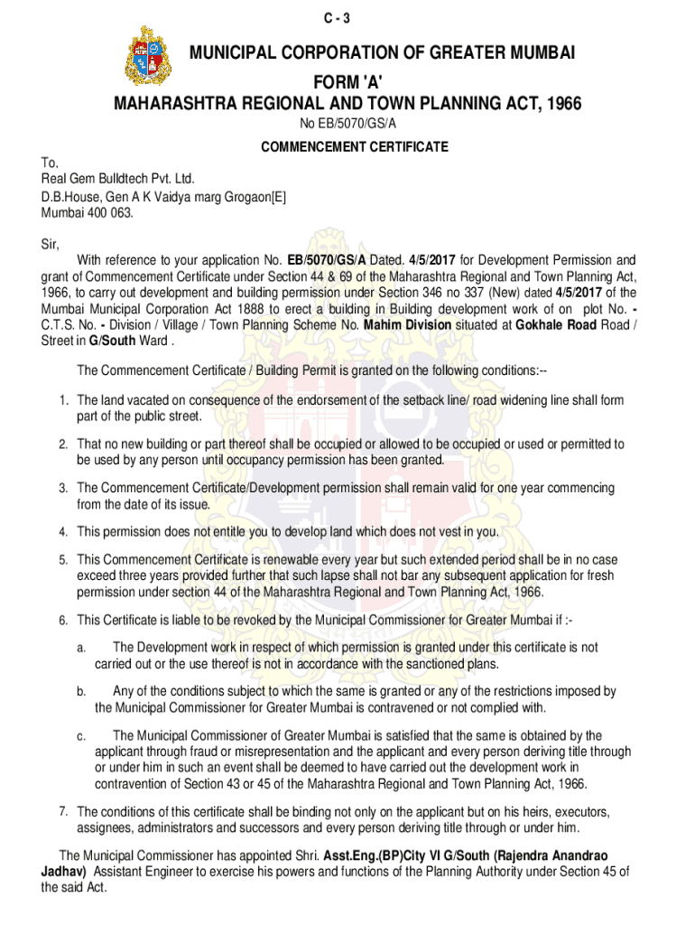 C3MUNICIPAL CORPORATION OF GREATER MUMBAI FORM \'A\' MAHARASHTRA REGIONAL AND TOWN PLANNING ACT, 1966 No EX/5070/GS/A COMMENCEMENT CERTIFICATE To, Real Gem Bulleted Pvt. Ltd. D.B. House, Gen A K Vienna