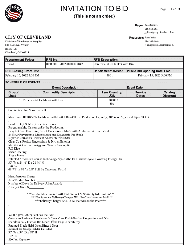 INVITATION TO BIDPage1 of(This is not an order.) Buyer: Jules Gilliam 2166642621 jgilliam@city.cleveland.oh.usCITY OF CLEVELANDRequestor: Janet Baird 2162656060 jbaird@clevelandairport.comDivision