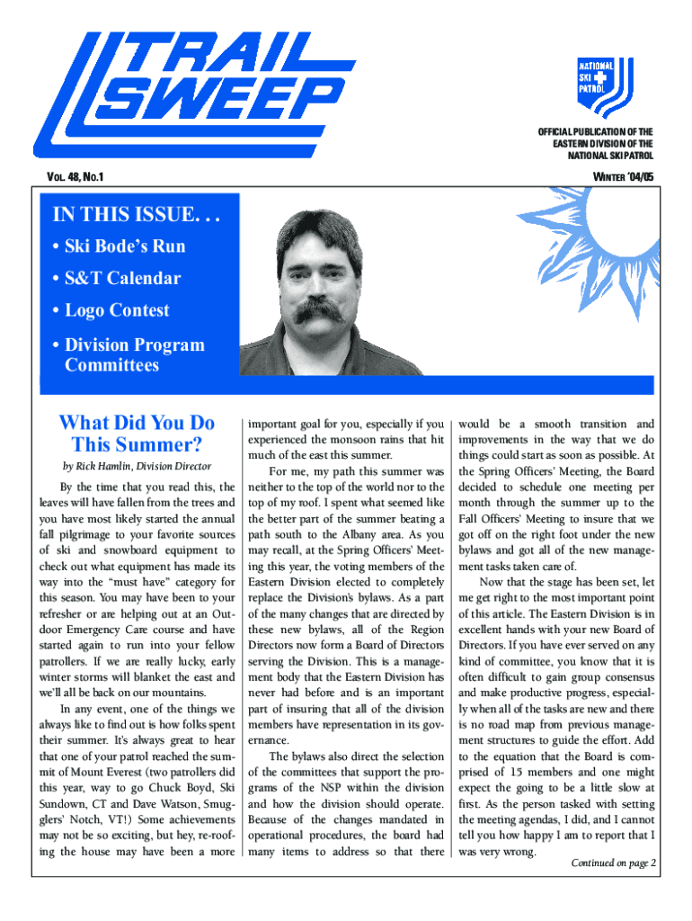 OFFICIAL PUBLICATION OF THE EASTERN DIVISION OF THE NATIONAL SKI PATROL. 48, NO.1WINTER 04/05IN THIS ISSUE. . . Ski Bodes Run S&T Calendar Logo Contest Division Program CommitteesWhat Did You Do This