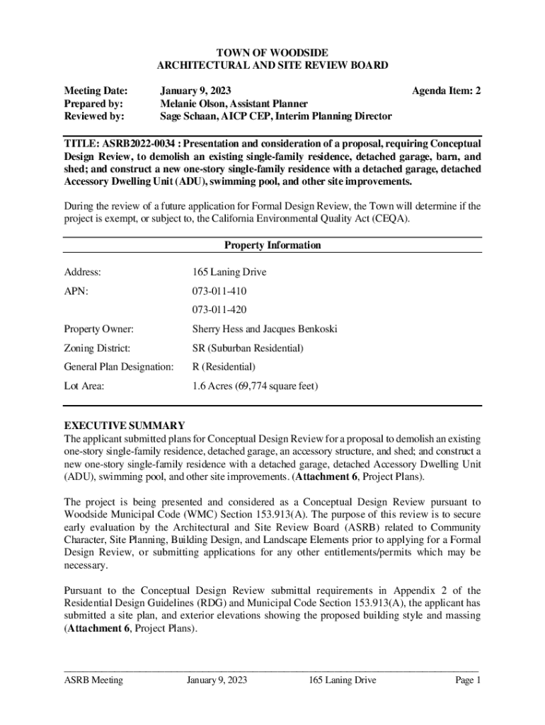 TOWN OF WOODSIDE ARCHITECTURAL AND SITE REVIEW BOARD Meeting Date: Prepared by: Reviewed by:January 9, 2023, Melanie Olson, Assistant Planner Sage Chain, ICP CEP, Interim Planning DirectorAgenda Item: