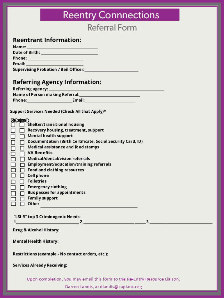 Reentry Connections Referral Form Reentrant Information: Name: Date of Birth: Phone: Email: Supervising Probation / Bail Officer:Referring Agency Information: Referring agency: Name of Person making