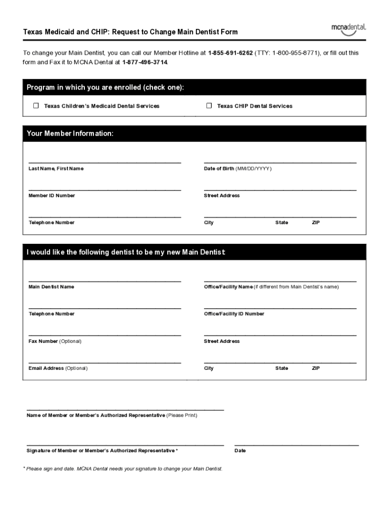 Texas Medicaid and CHIP: Request to Change Main Dentist Form To change your Main Dentist, you can call our Member Hotline at 18556916262 (TTY: 18009558771), or fill out this form and Fax it to MONA