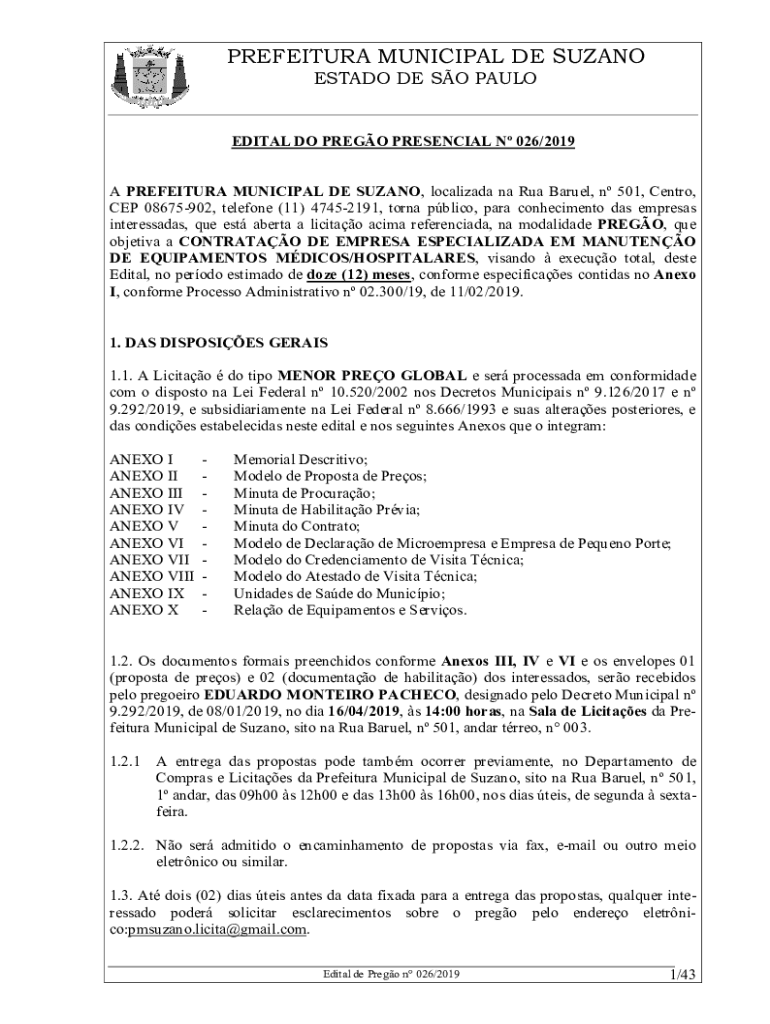 ESTATE DE SO PAULOEDITAL DO PRESO PRESENCE N 026/2019A PREFECTURE MUNICIPAL DE SUZANA, localized Na RUA Barrel, n 501, CENTR,