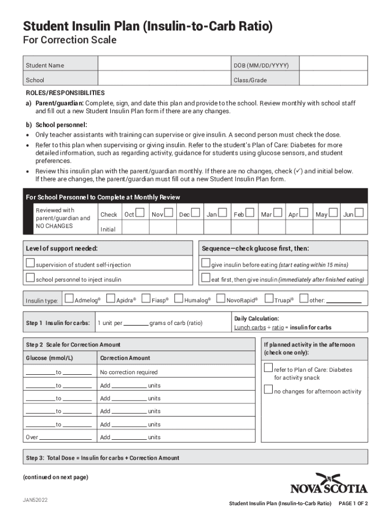 Student Insulin Plan (InsulintoCarb Ratio)