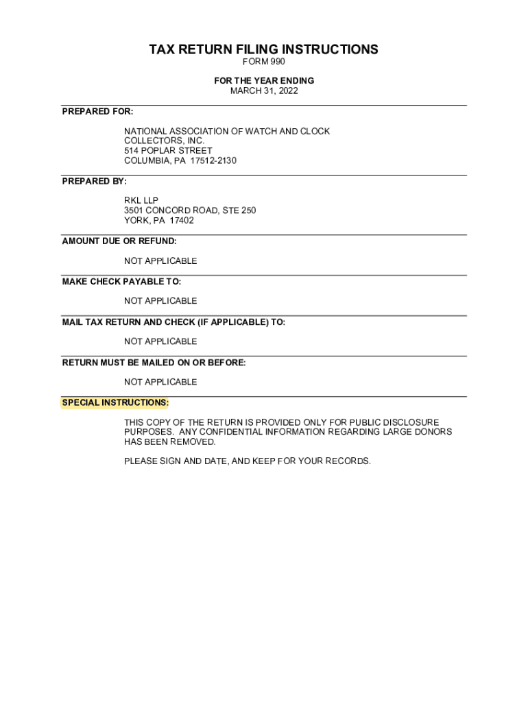 TAX RETURN FILING INSTRUCTIONS FORM 990FOR THE YEAR ENDING MARCH 31, 2022, PREPARED FOR: NATIONAL ASSOCIATION OF WATCH AND CLOCK COLLECTORS, INC. 514 POPLAR STREET COLUMBIA, PA 175122130 PREPARED